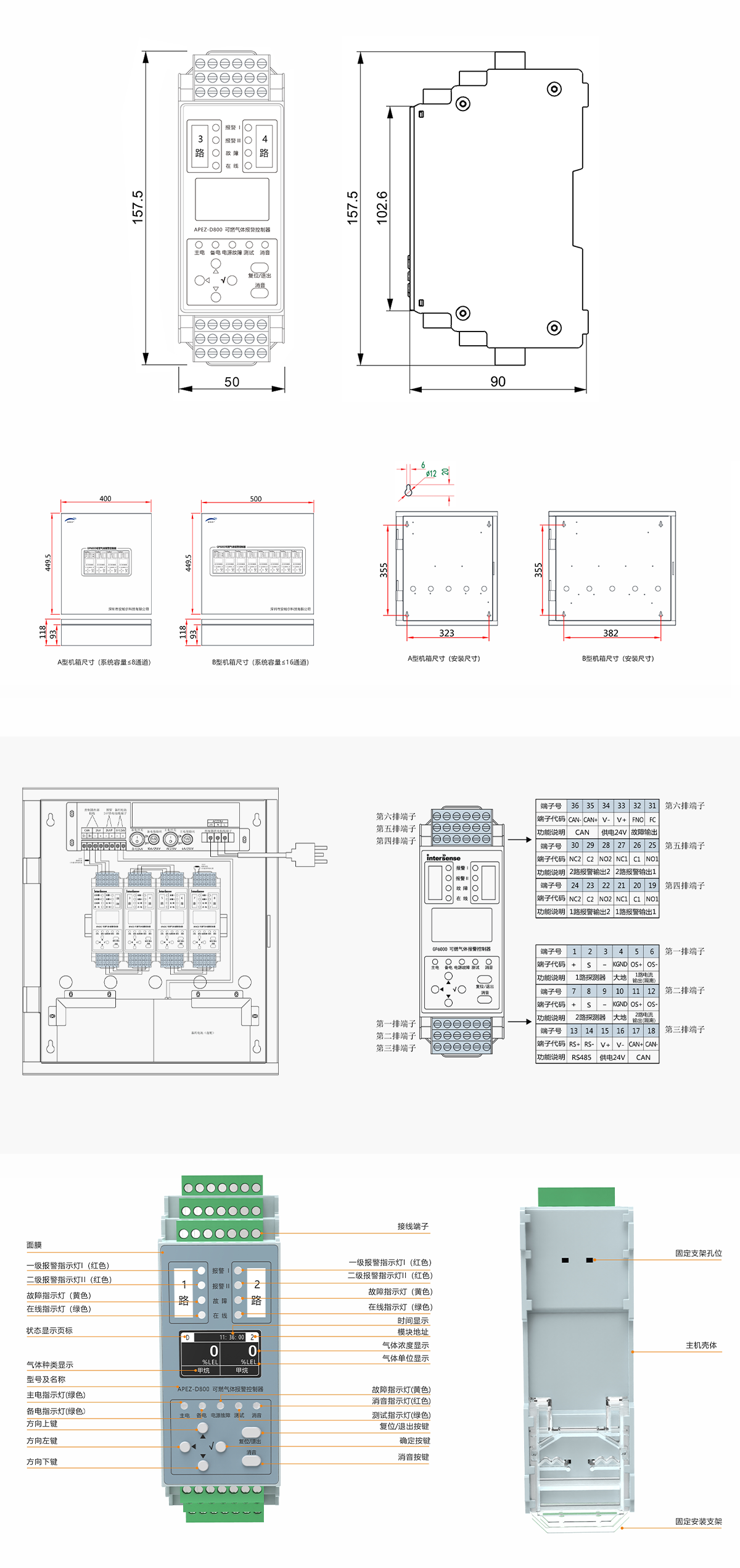每單元1個總故障繼電器,1個RS485( Modbus),2通道電流輸出;每通道有各自的低警繼電器、高警繼電器 |