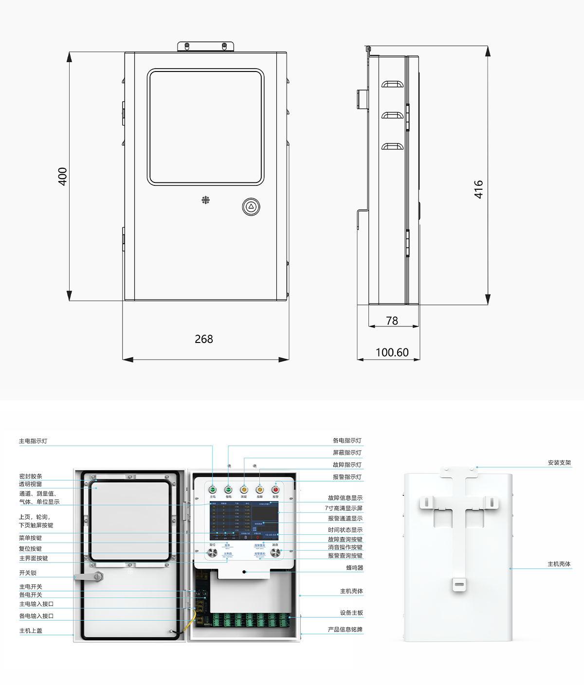 總體尺寸:高*寬*厚=約416mm*268mm*101mm(不含安裝支架);進出線孔尺寸:直徑30mm; |